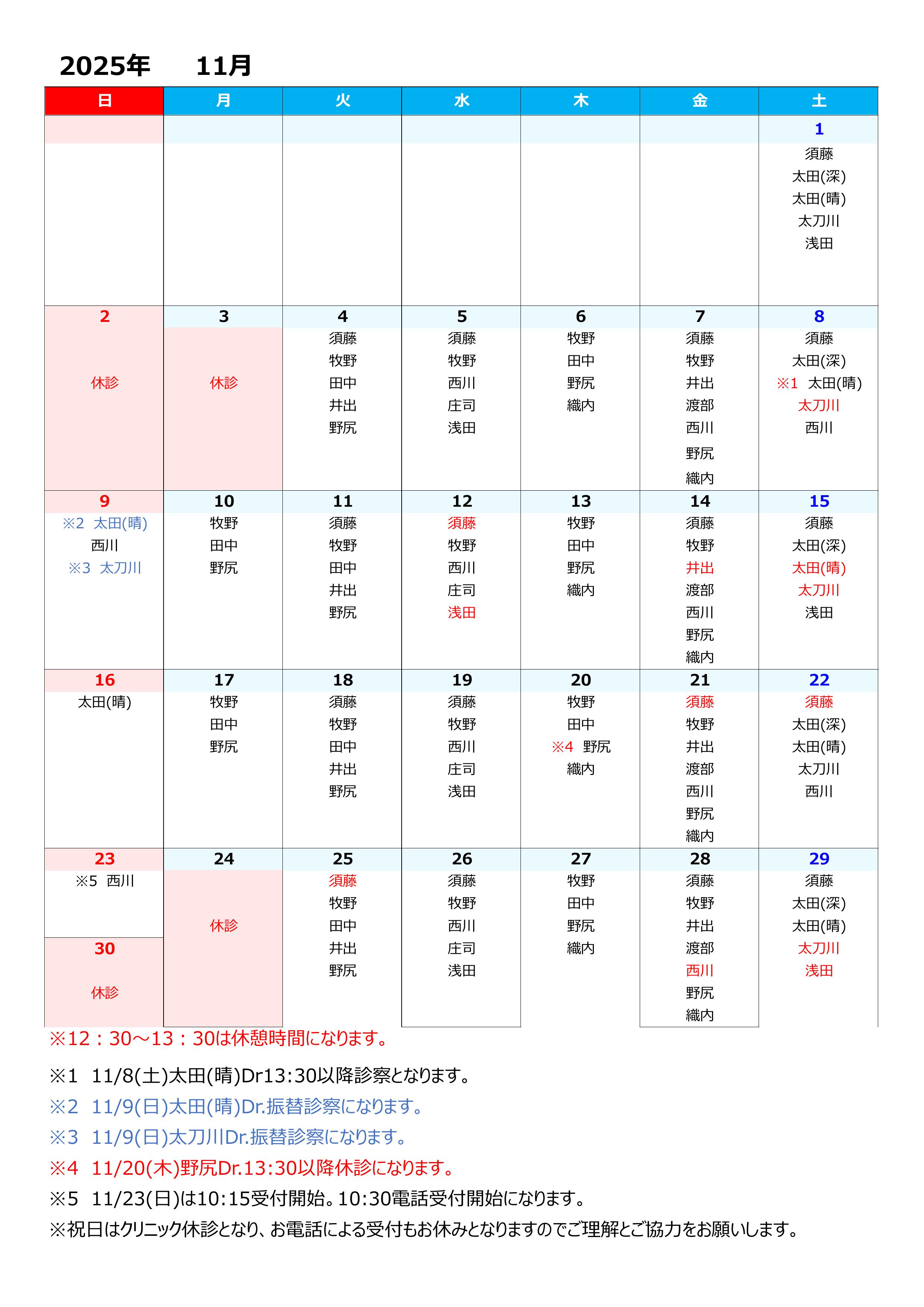 ※ 祝日はクリニック休診となり、お電話による受付もお休みとなりますのでご理解とご協力をお願いします。