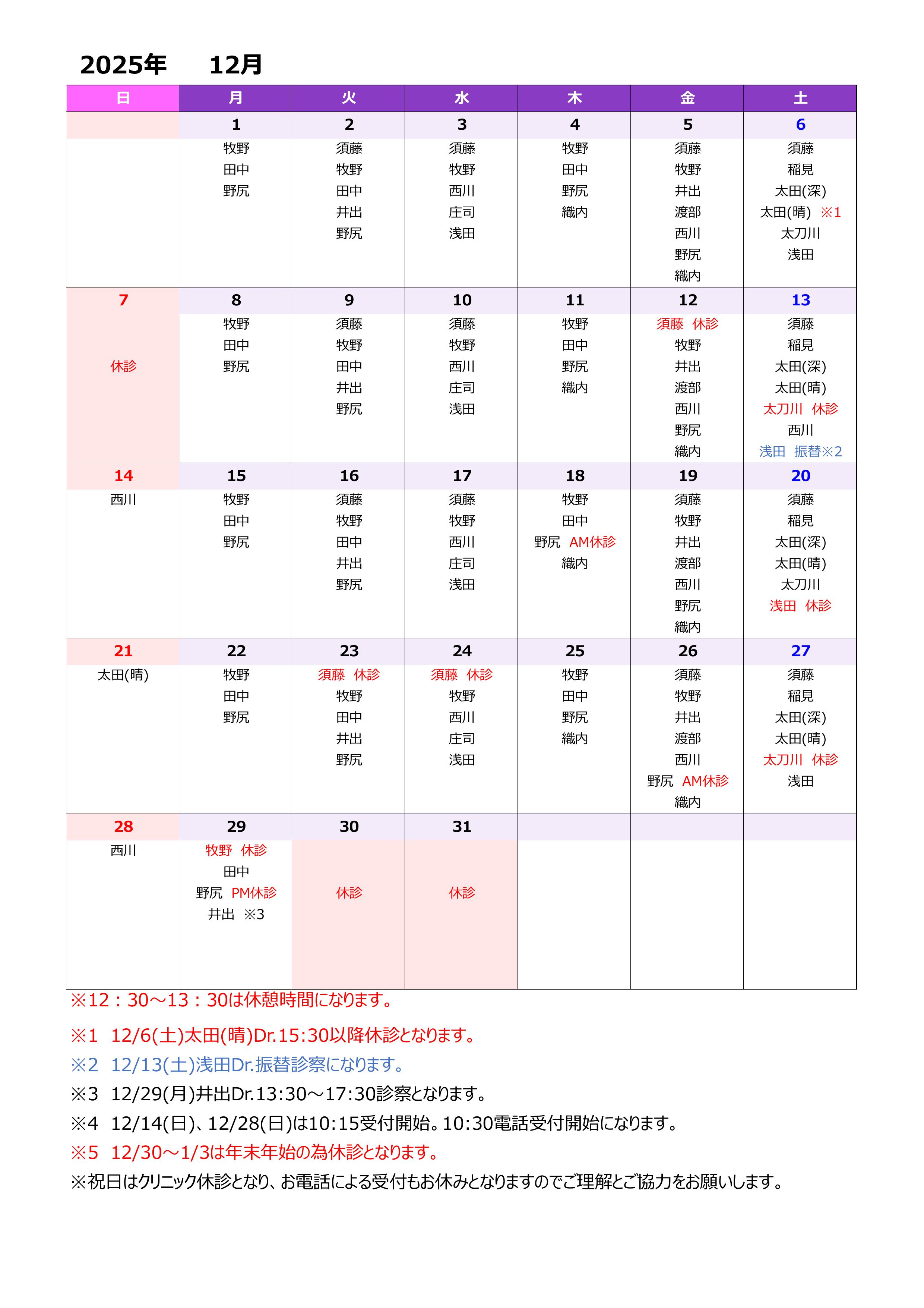 ※1 12/6(土)太田(晴)Dr.15:30以降休診となります。
