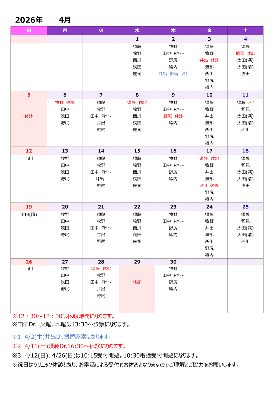 祝日はクリニックお休みとなり、お電話による受付もお休みとなりますのでご理解とご協力をお願い致します。